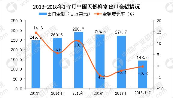 2015年-2018年1-7月中國天然蜂蜜出口金額逐漸減少,2018年1-7月中國天然蜂蜜出口金額為143百萬美元,同比下降0.3%。
