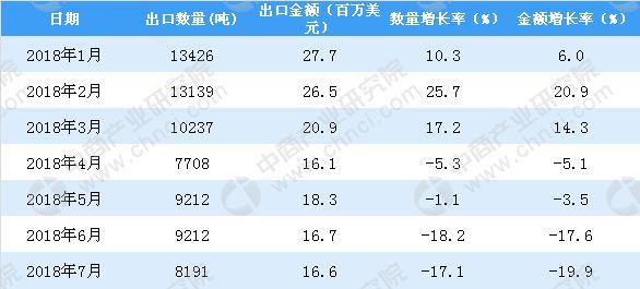 2018年1-7月中國天然蜂蜜出口數(shù)量及金額增長率情況